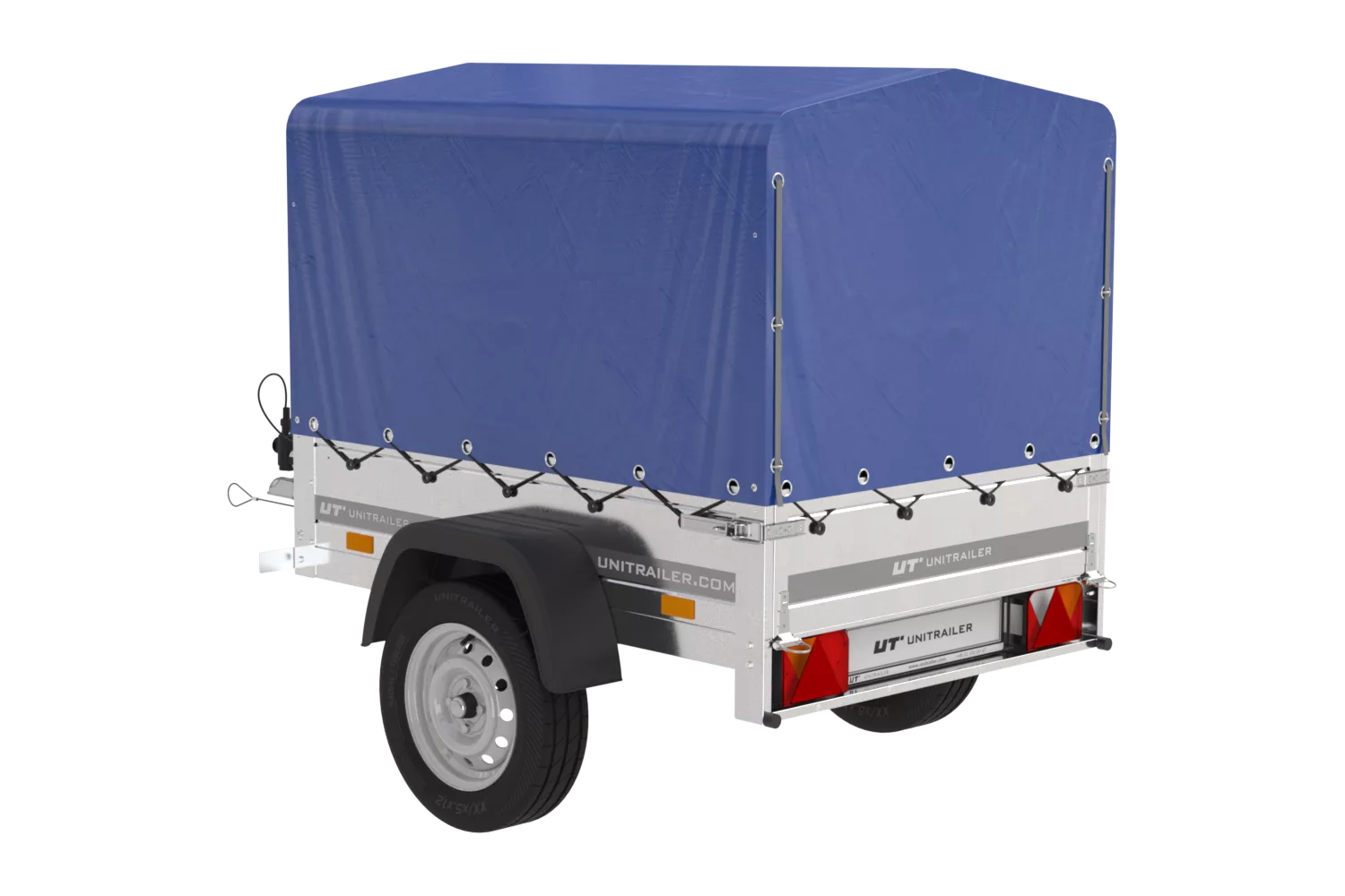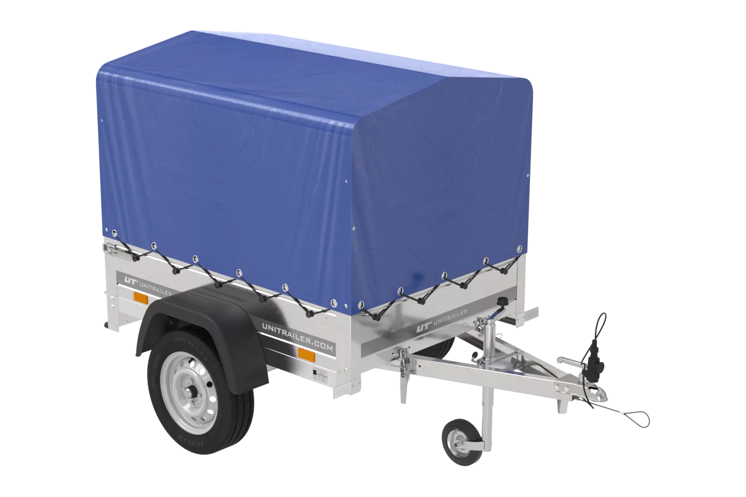 Anhænger 150 TIP 150×106 cm [med blå høj presenning, bøjler og støttehjul]