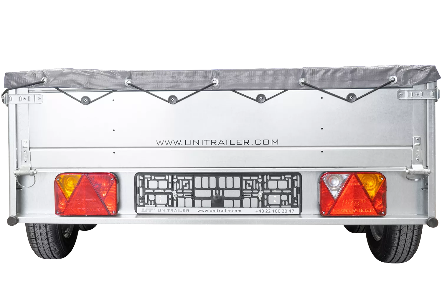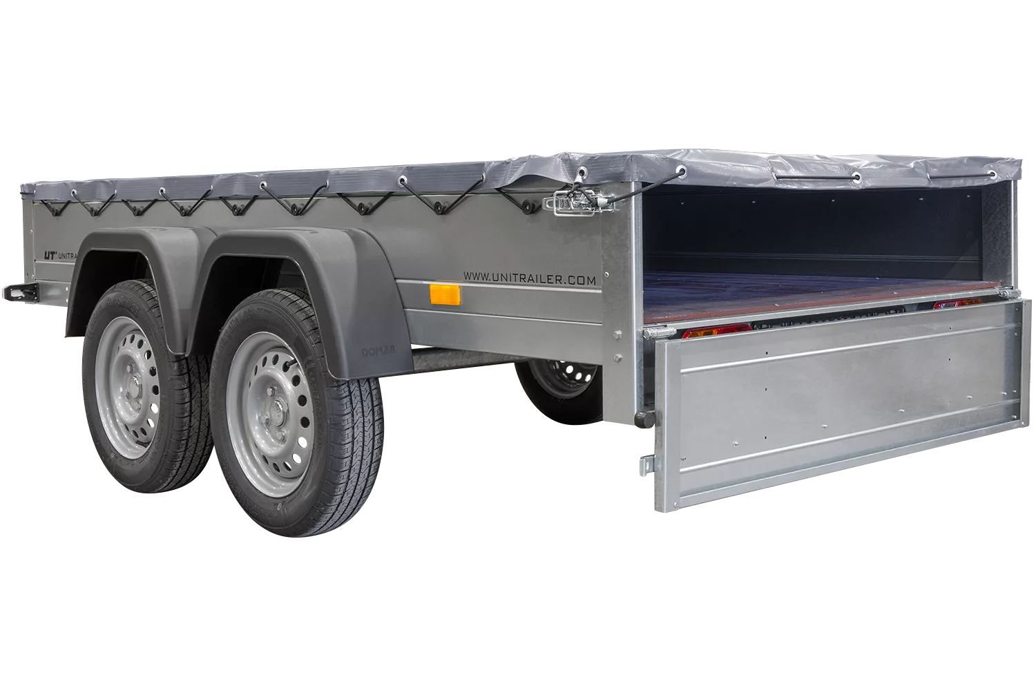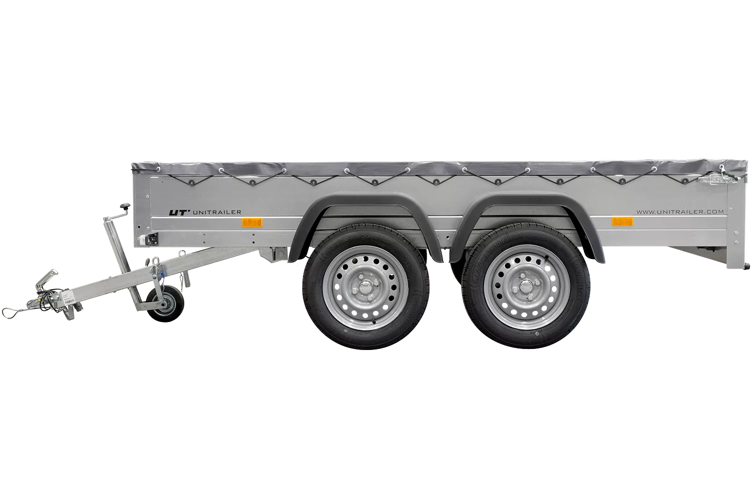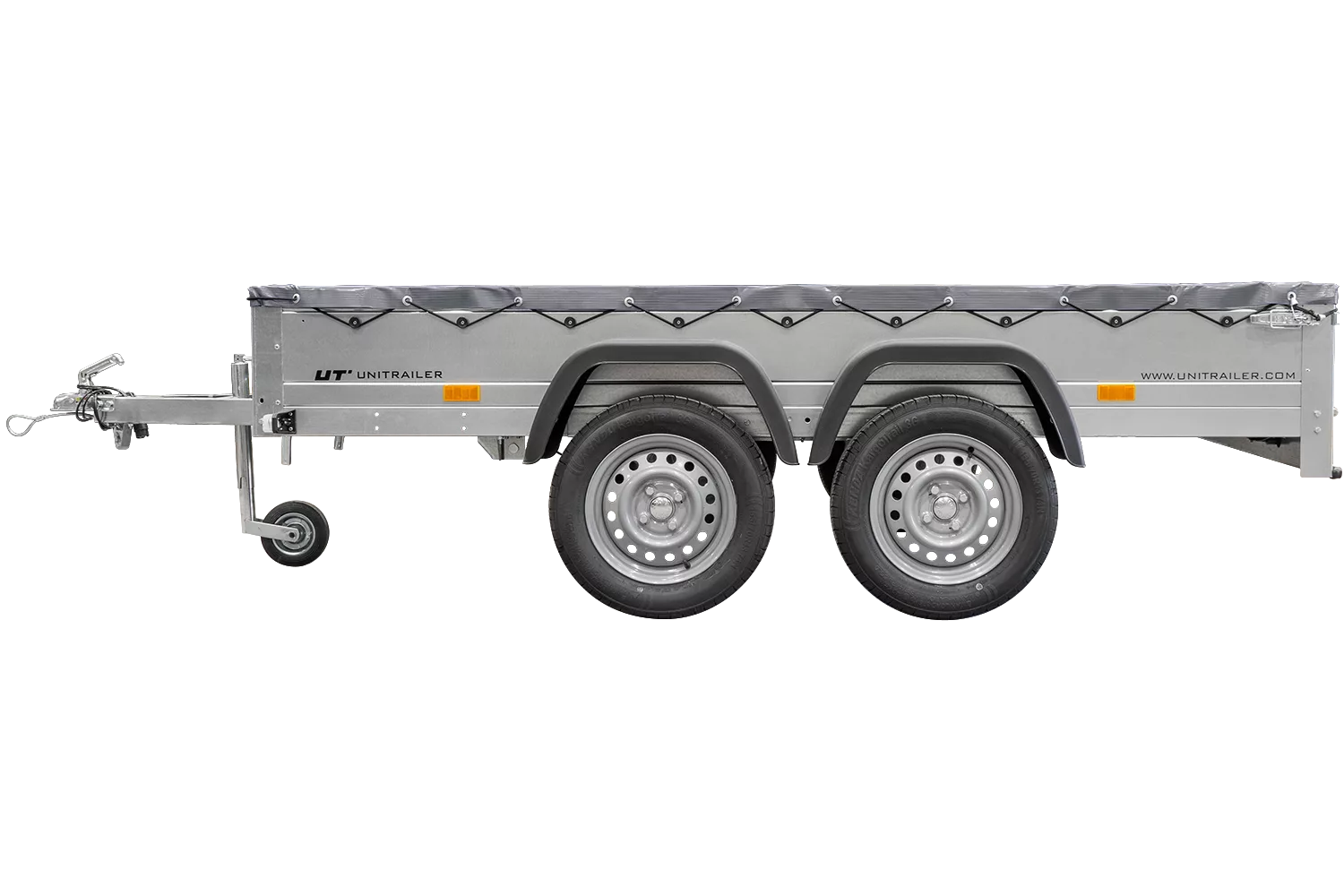 Havetrailer 264/2 tip Mit støttehjul, Graue flad presenning Und presenningsstøtter er en tiptanhænger af høj kvalitet fra Unitrailer, som kan kobles til enhver personbil med B-kørekort. Anhængerens kippbare ladeflade gør det meget nemt at laste og losse gods – særligt løst materiale som grus, jord og affald. Den kan klares uden at løfte tungt, da materialet simpelthen skubbes direkte på fladen.