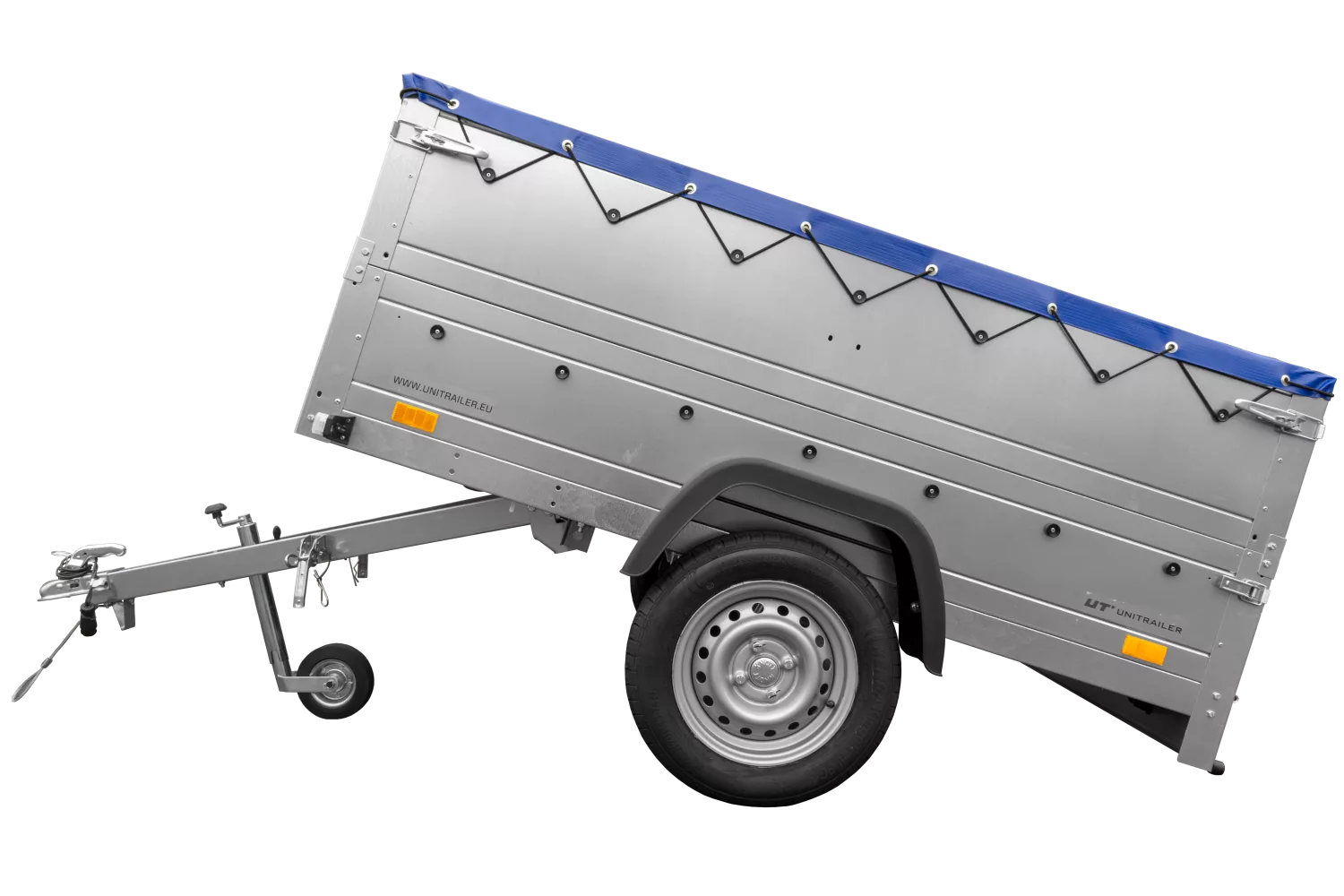 Køretøjsanhænger 750 kg Havetrailer 201 TIP med ekstra sidetofter, støttehjul og blå flad presenning er en tiptanhænger af høj kvalitet fra Unitrailer, som kan kobles til enhver personbil med B-kørekort. Anhængerens kippbare ladeflade gør det meget nemt at laste og losse gods – særligt løst materiale som grus, jord og affald. Den kan klares uden at løfte tungt, da materialet simpelthen skubbes direkte på fladen.