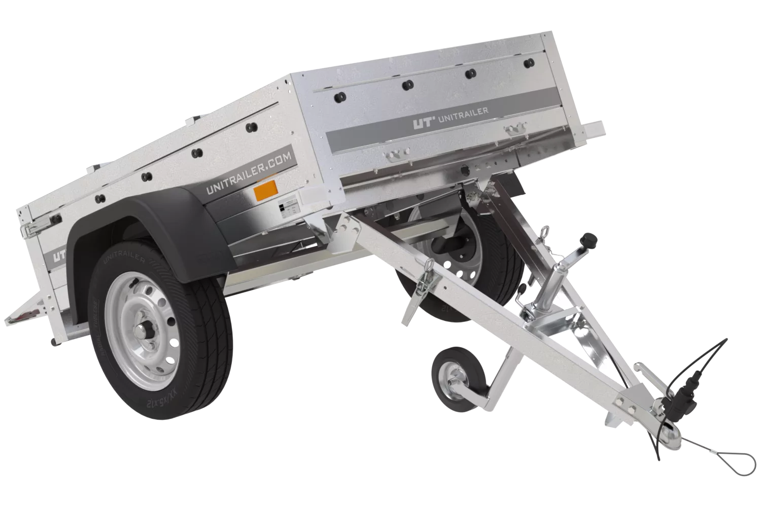 Lille anhænger Havetrailer 150 TIP 150×106 cm 750kg er en tiptanhænger af høj kvalitet fra Unitrailer, som kan kobles til enhver personbil med B-kørekort. Anhængerens kippbare ladeflade gør det meget nemt at laste og losse gods – særligt løst materiale som grus, jord og affald. Den kan klares uden at løfte tungt, da materialet simpelthen skubbes direkte på fladen.