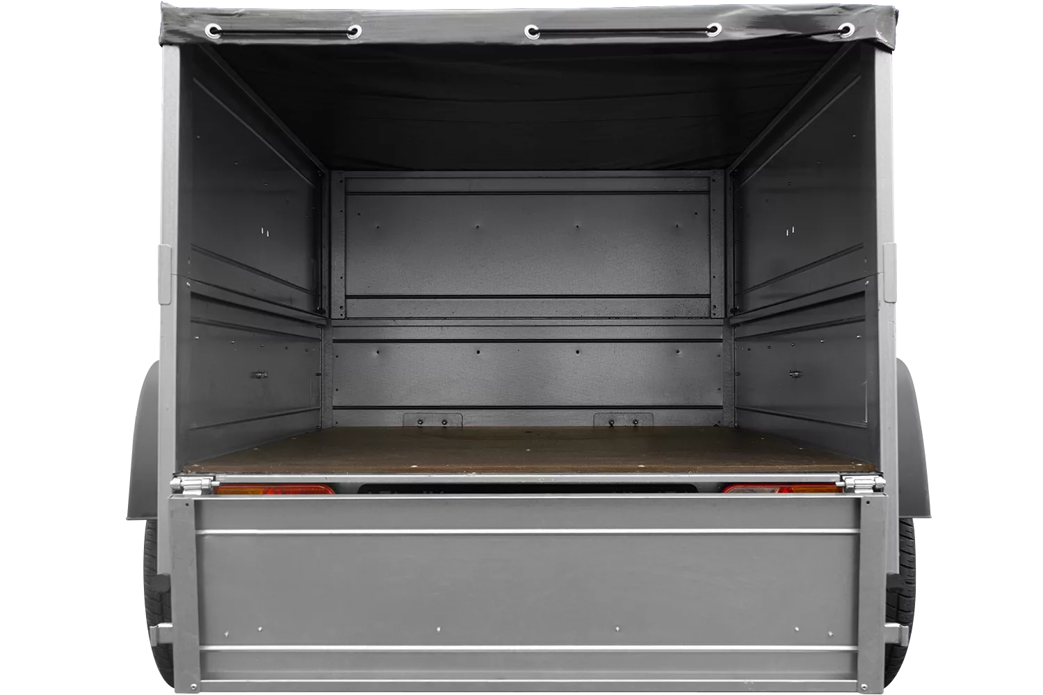 Ny personbilanhænger Havetrailer 150 TIP med ekstra sidetofter, støttehjul og grå flad presenning