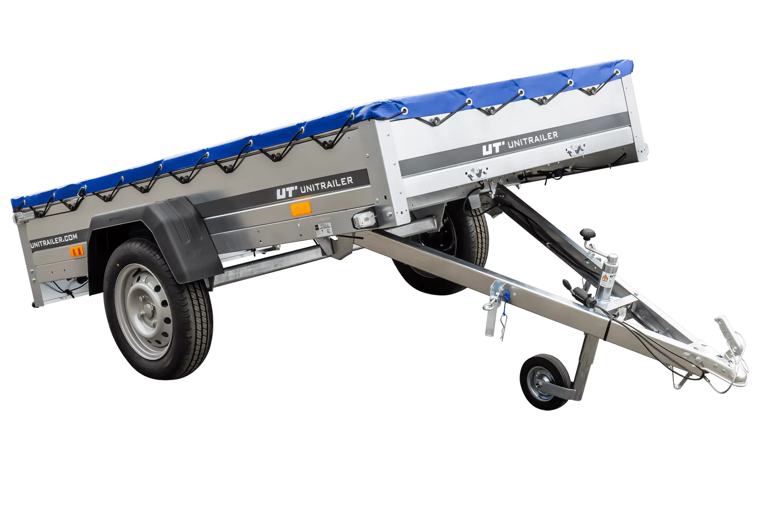 Personbil tippanhænger Havetrailer 230 TIP [230 cm x 125 cm] med flad presenning, støttehjul og presenningsstøtter er en tiptanhænger af høj kvalitet fra Unitrailer, som kan kobles til enhver personbil med B-kørekort. Anhængerens kippbare ladeflade gør det meget nemt at laste og losse gods – særligt løst materiale som grus, jord og affald. Den kan klares uden at løfte tungt, da materialet simpelthen skubbes direkte på fladen.